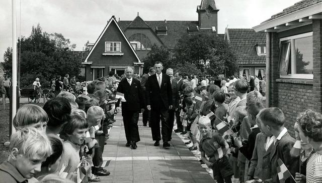 Burgemeester van Ek van Achtkarspelen en schoolvoorzitter I.F. Kamminga openen de nieuwe school op 20 juli 1960. Foto: Historische Kring Gerkesklooster-Stroobos