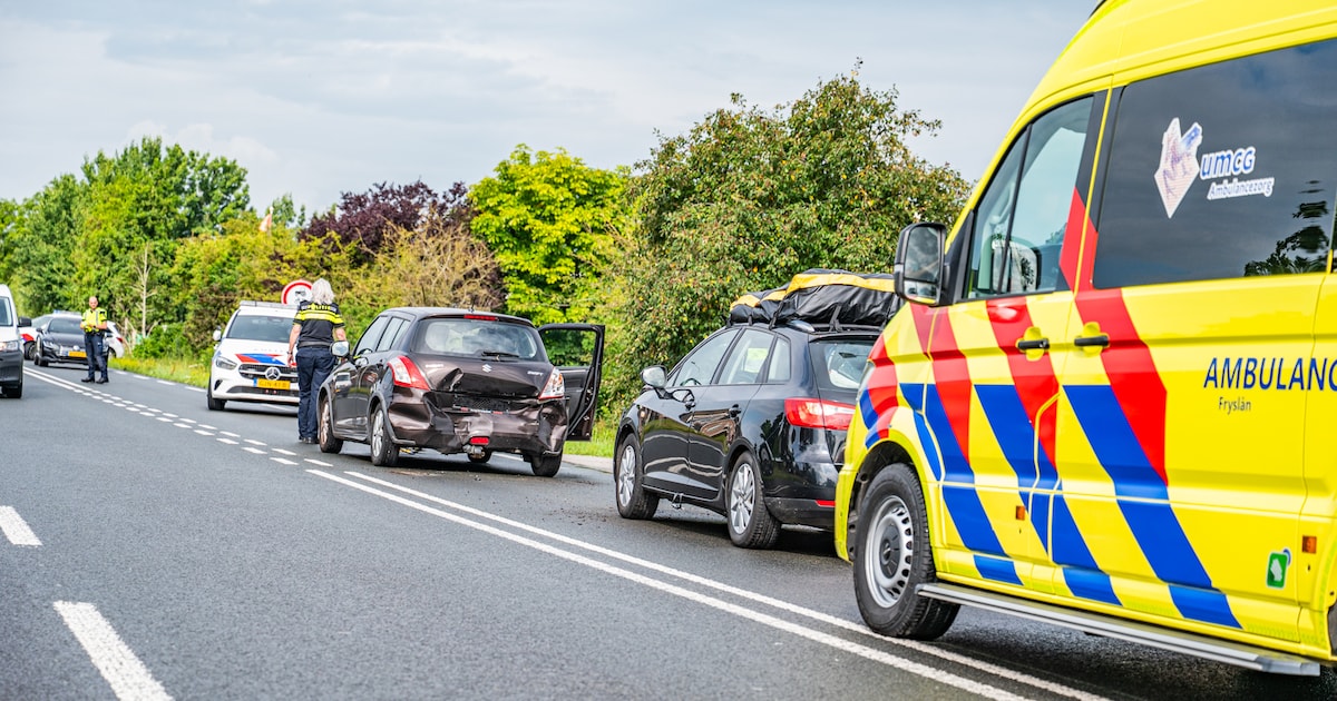 Drie auto's zijn dinsdagochtend hard met elkaar in botsing gekomen op de Rykswei in Kootstertille. De inzittenden, waaronder kinderen zijn door ambulancepersoneel nagekeken maar raakten niet gewond.