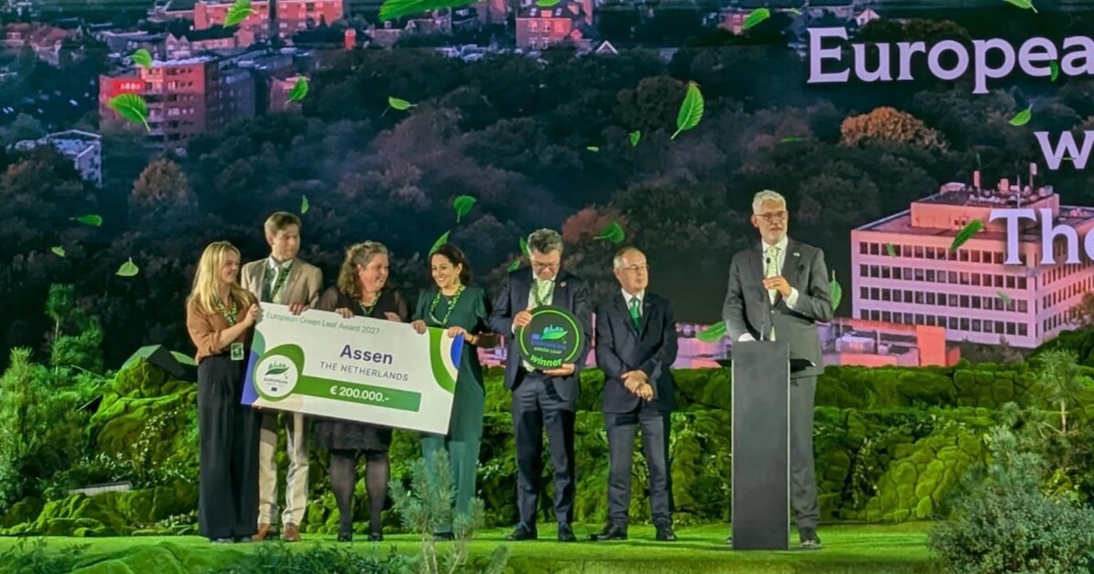 Assen heeft de European Green Leaf Award 2027 gewonnen. Deze prijs is voor steden tot 100.000 inwoners die uitblinken in duurzaamheid en klimaatadaptatie.