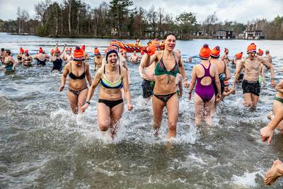 WESTERHOVEN - De ene gaat kopje onder, de andere dompelt met een angstige gil net een grote teen onder. Bijna vierhonderd mensen renden maandagmiddag het water van De Kempervennen in voor de Nieuwjaarsduik. ,,Dit is heerlijk.”