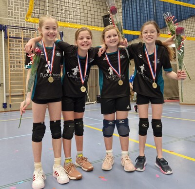 BEUGEN/OEFFELT/RIJKEVOORT Deze vier meisjes zijn kampioen geworden en spelen niveau 4 voor volleybalclub Vocala uit Oeffelt, Beugen en Rijkevoort.