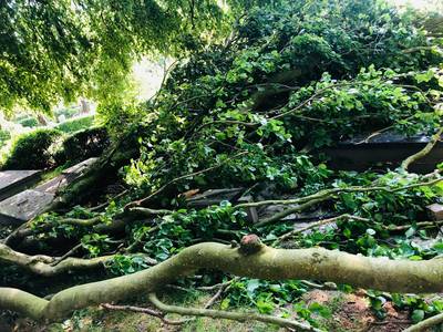 PRINCENHAGE - Op begraafplaats Sint Martinus in Princenhage zijn twee graven beschadigd door een afgebroken boomtak. Het parochiebestuur neemt contact op met de betrokken families.