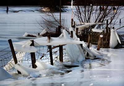 RIJSWIJK - Het oogt als een bizar winters spektakel, maar het komt Rijswijkenaren niet onbekend voor: de ijsschotsen hangen nog heel hoog in de bomen, hekken en prikkeldraden in de uiterwaarden langs de Lek bij Rijswijk.