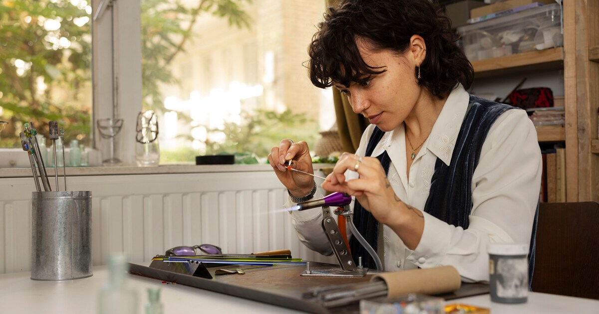 Amber van Gastel (24) uit Delft, masterstudent industrieel ontwerp, raakte gefascineerd door glas nadat ze enkele jaren geleden een workshop glaskralen blazen deed. Glas is volgens haar iets breekbaars waar je voorzichtig mee moet omgaan, wanneer het breekt roept iedereen ‘pas op’.