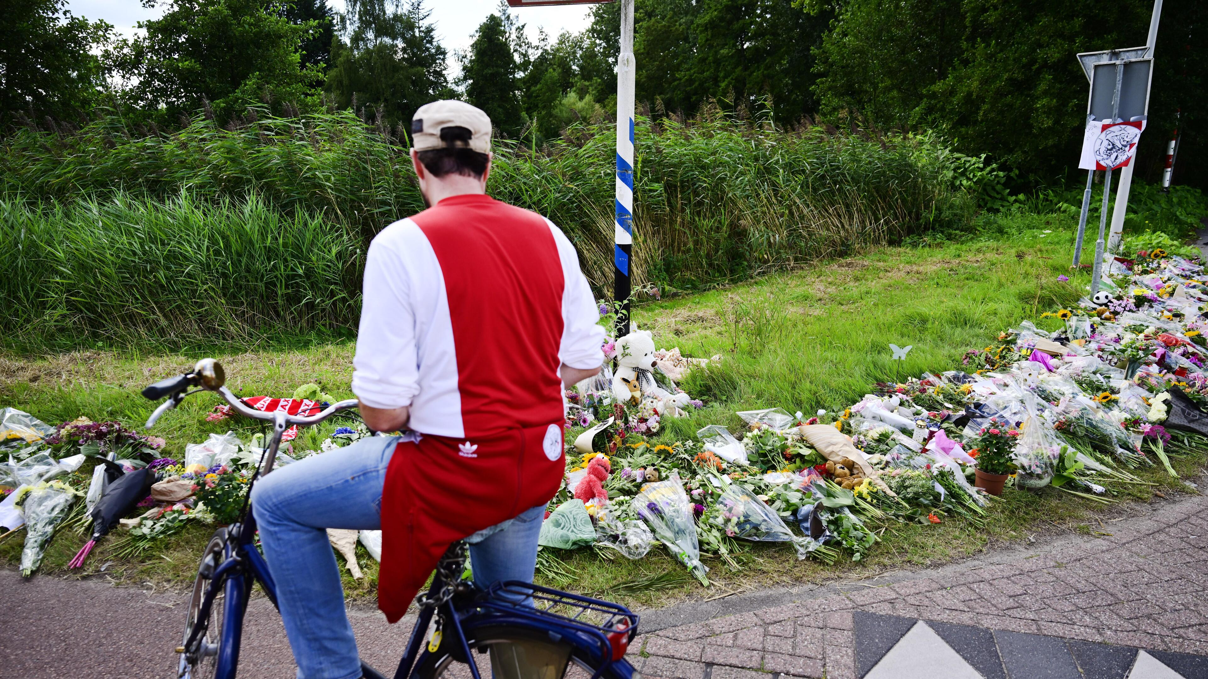 Talloze mensen waaronder ook Ajax-fans leggen bloemen neer langs de Holterbergweg voor de in Amsterdam omgebrachte Lisa (17) uit Abcoude. Â