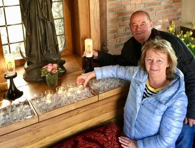 AGELO - Ans en Jan Wilbers wijzen naar het grote aantal brandende kaarsen in de rustieke Mariakapel in Agelo. Een ongekend aantal. De kaarsen zijn de laatste twee weken niet aan te slepen. „In nood leren de mensen kennelijk weer bidden.”