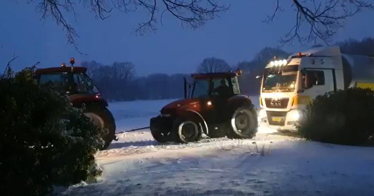 Drie zware tractoren moesten er in de buurtschap Nutter aan te pas komen om een melktankwagen los te trekken. Op het platteland zitten de zware wagens om de haverklap vast in de opgewaaide sneeuwhopen. „Ophalen van de melk gaat heel moeizaam met dit extreme weer.â€
