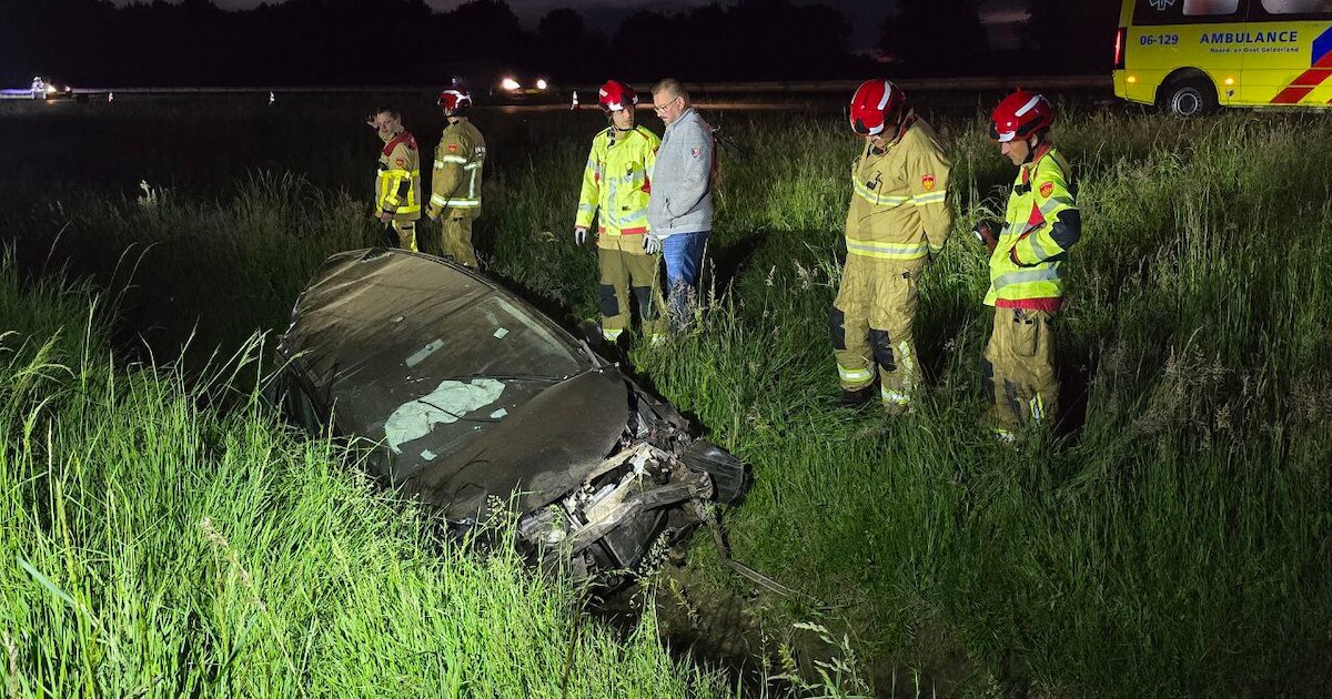 Een auto is zondagavond over de kop geslagen op de A18 bij Wehl, waarna het voertuig zwaar beschadigd in een sloot tot stilstand kwam.