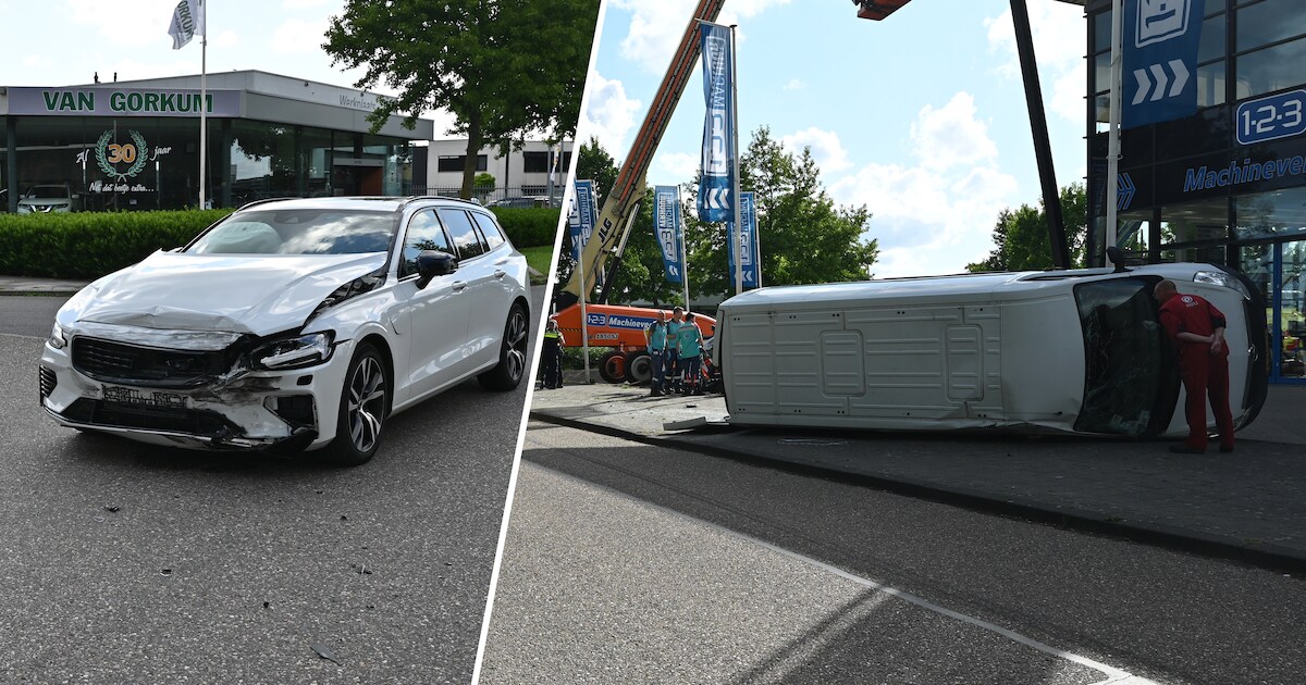 Een opvallende botsing in Dronten, maandag aan het einde van de middag. Bij een botsing tussen een auto en een bestelbusje eindigde de bus op zijn kant, tientallen meters verderop.