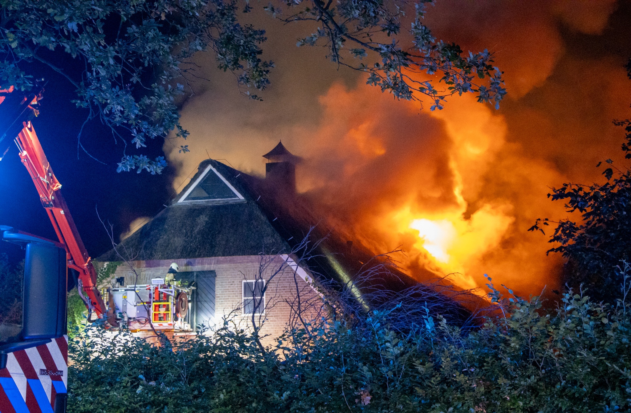 EMMEN – Op donderdagavond vatte het rieten dak van een woomboerderij in de straat Noordeind in Emmen vlam. Het vuur sloeg metershoog uit het dak van de onbewoonde boerderij, die eigendom is van ondernemer Vasco Rouw.