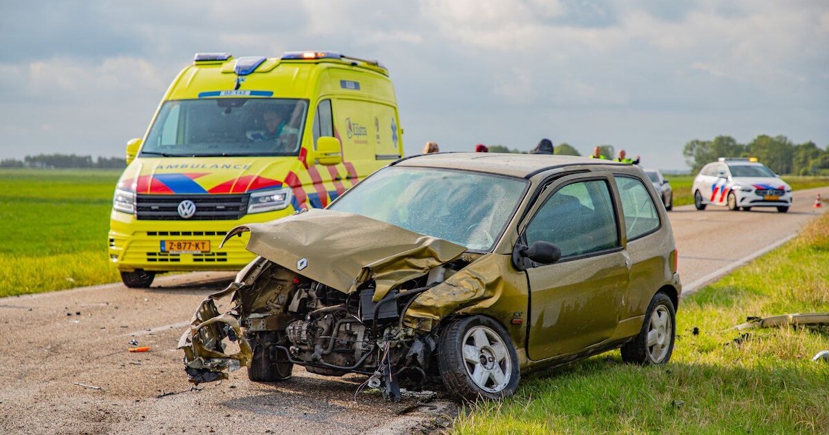 Twee auto's zijn vrijdagochtend met een enorme klap op elkaar gebotst op de Wiereweg in Burdaard. De ravage na de aanrijding is enorm. Een traumahelikopter landde langs de weg.