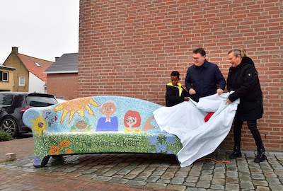 OUDENBOSCH - Tussen de 30.000 steentjes kan de 9-jarige Aman precies het laatste mozaïekstukje aanwijzen dat hij op de social sofa heeft geplakt. De bank is vrijdag op het Jan Gielenplein in Oudenbosch onthuld.