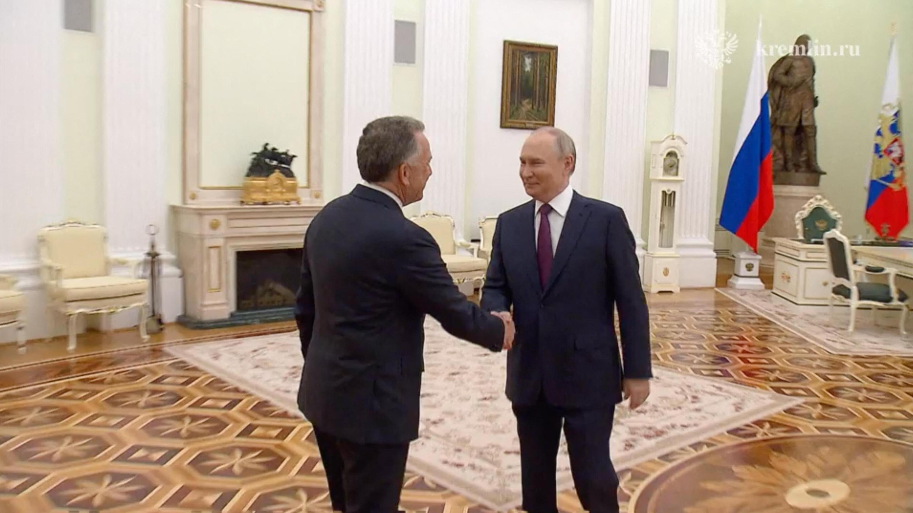 Steve Witkoff, de gezant van Amerikaans president Donald Trump, heeft in de Russische hoofdstad Moskou samengezeten met Russisch president Vladimir Poetin. Het Kremlin deelde beelden waarop te zien is hoe Witkoff en Poetin elkaar de hand schudden en beleefdheden uitwisselen, waarna ze tegenover elkaar plaatsnemen aan een witte ovalen tafel.