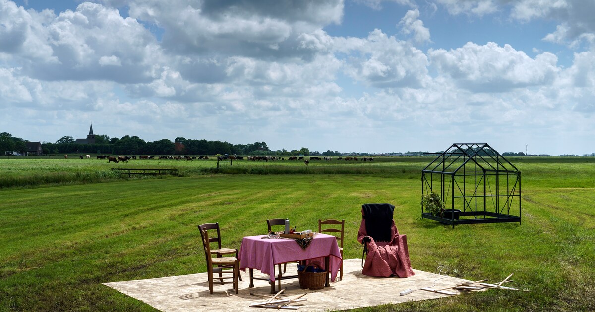 In een weiland achter een boerderij in Blessum wordt gerepeteerd voor het locatietheaterstuk van de Friese klassieker 'De sûnde fan Haitze Holwerda'. In de verte het kerkje van Boksum, geboortedorp van Ulbe van Houten.