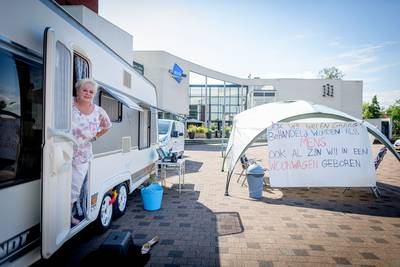 GOOR - Martha Wolters en haar man en zoon Kobus en Jan van Engelen eisen twee standplaatsen voor een woonwagen. Om dat kracht bij te zetten bivakkeren ze in een caravan voor het gemeentehuis in Goor. Burgemeester Ellen Nauta zegt dat ze geduld zullen moeten hebben en dat er geen zekerheden zijn.