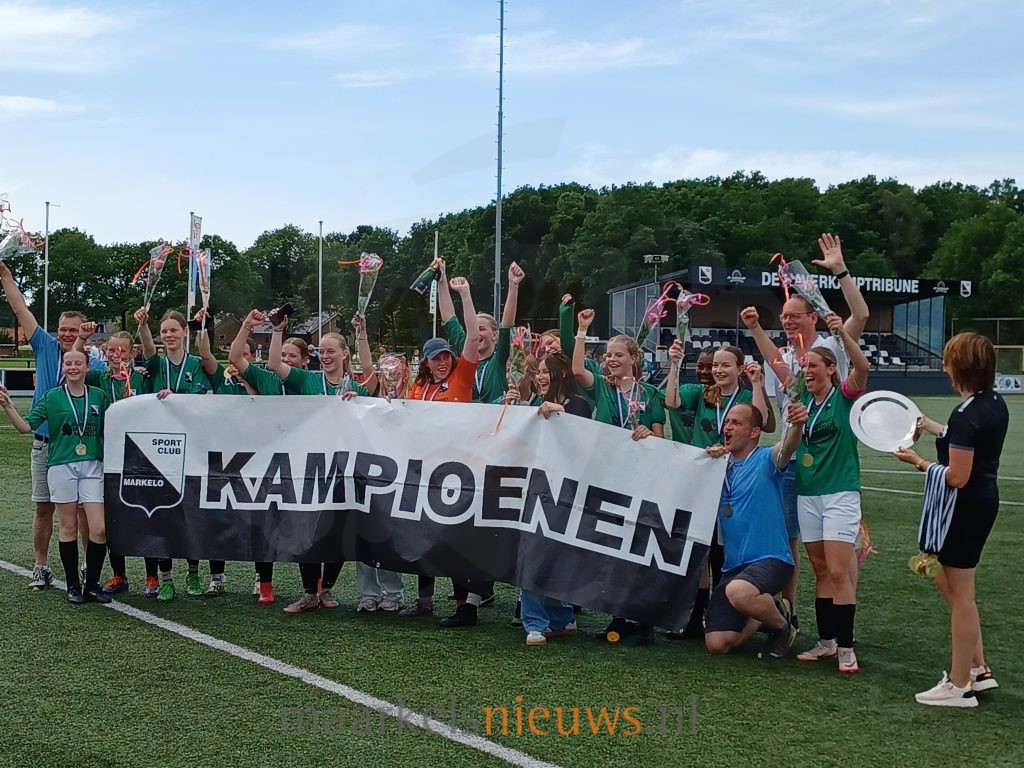 Eigenlijk waren de meiden van Sportclub Markelo MO17-1 de afgelopen week al kampioen, maar de laatste wedstrijd van het seizoen wilden ze toch ook echt winnen. Ze hadden veel schoten op doel nodig tegen Sportclub Neede MO17-1, maar het lukte. Met een 2-0 eindstand op het scorebord kon het kampioensfeestje beginnen. Tegelijkertijd speelde op het naastgelegen veld SC Markelo MO20-1 in fantasieopstelling haar laatste wedstrijd van het seizoen, tegen VVOP MO20-1 uit Voorthuizen. Het team nam in deze wedstrijd afscheid van Sascha Mooijman.