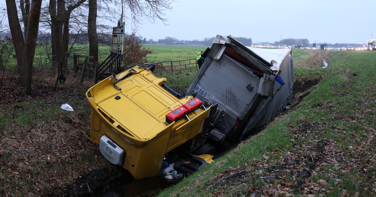 Een vrachtwagen is dinsdagmiddag naast de A7 beland en een sloot ingereden. Dat gebeurde na een aanrijding met een automobilist, meldt de politie. Hoe het ongeluk kon gebeuren is onduidelijk. De chauffeur is ongedeerd.
