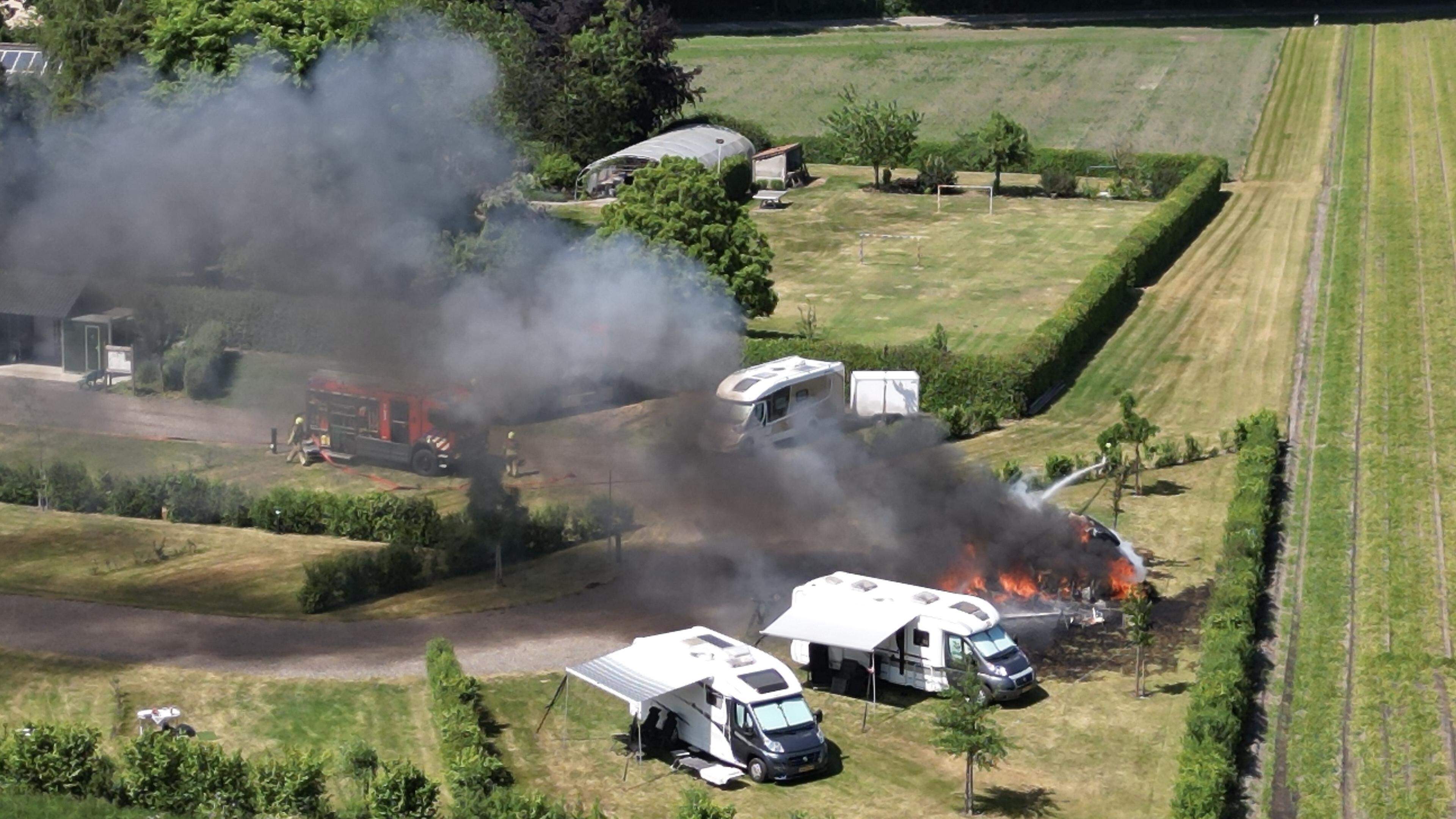 De camper op de camping aan de Bergsteeg vatte rond 14.20 uur door onbekende oorzaak vlam en stond al gauw in lichterlaaie. De brand ging gepaard met flinke rookontwikkeling en meerdere luide knallen, vermoedelijk veroorzaakt door ontploffende gasflessen.