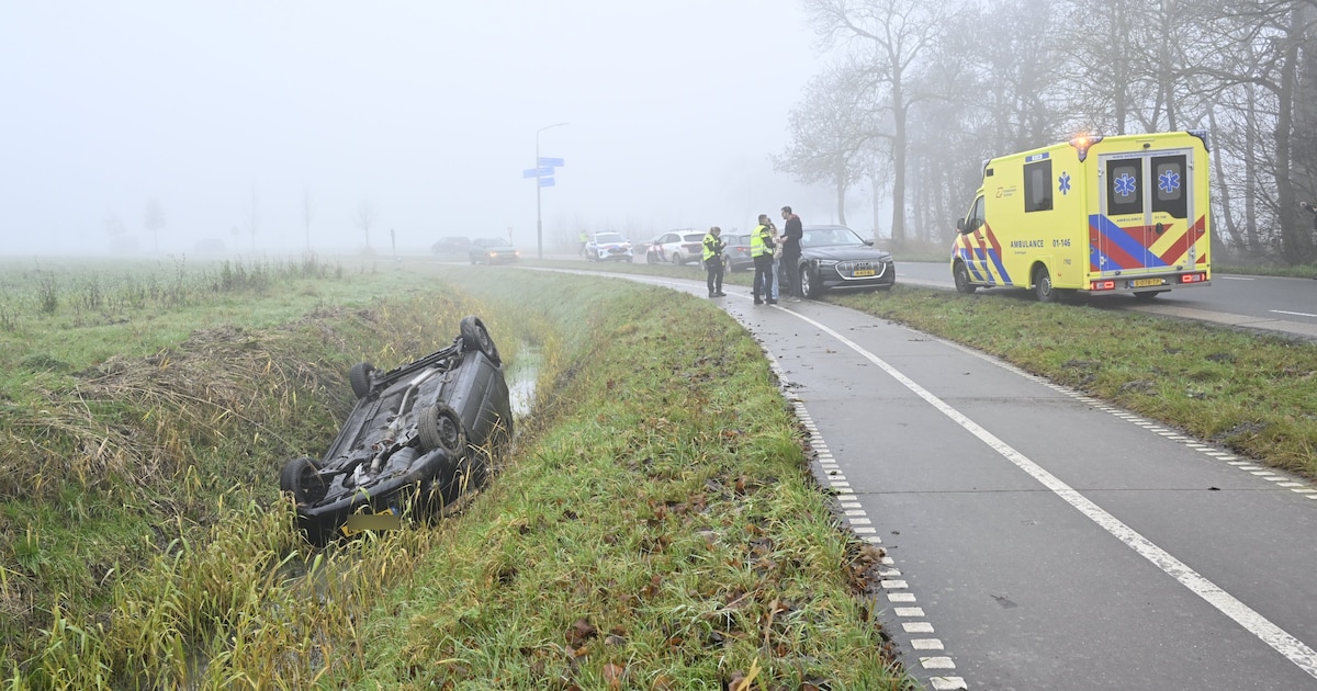 Een automobilist is zaterdagmiddag van de Delleweg in Stedum geraakt en op zijn kop in een sloot terecht gekomen. De persoon is gecontroleerd in een ambulance.