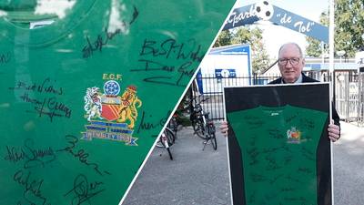 KILDER/ AALTEN - Vol trots toont hij de lijst met daarin een grasgroen shirt van Manchester United. Theo Klein Hesselink (69) uit Aalten heeft ’m net op de kopt getikt op de eerste Voetbalbeurs van het Oosten in Kilder.