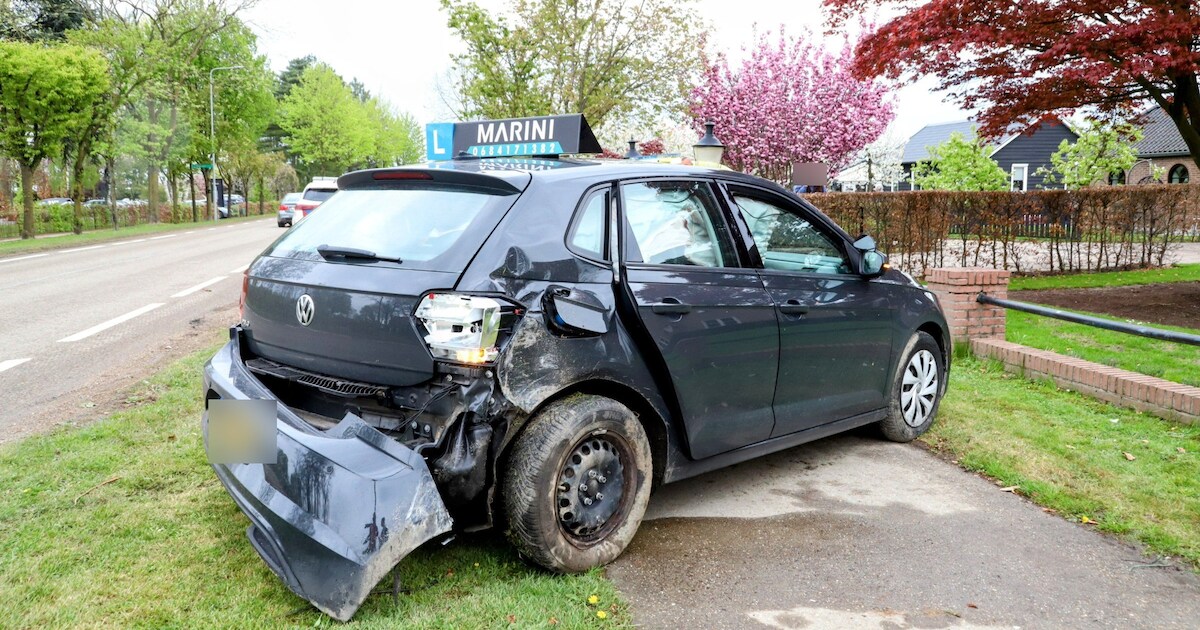 Een lesauto is dinsdag flink beschadigd geraakt bij een botsing in Kesteren. Na controle door het ambulancepersoneel bleek dat niemand naar het ziekenhuis hoefde.