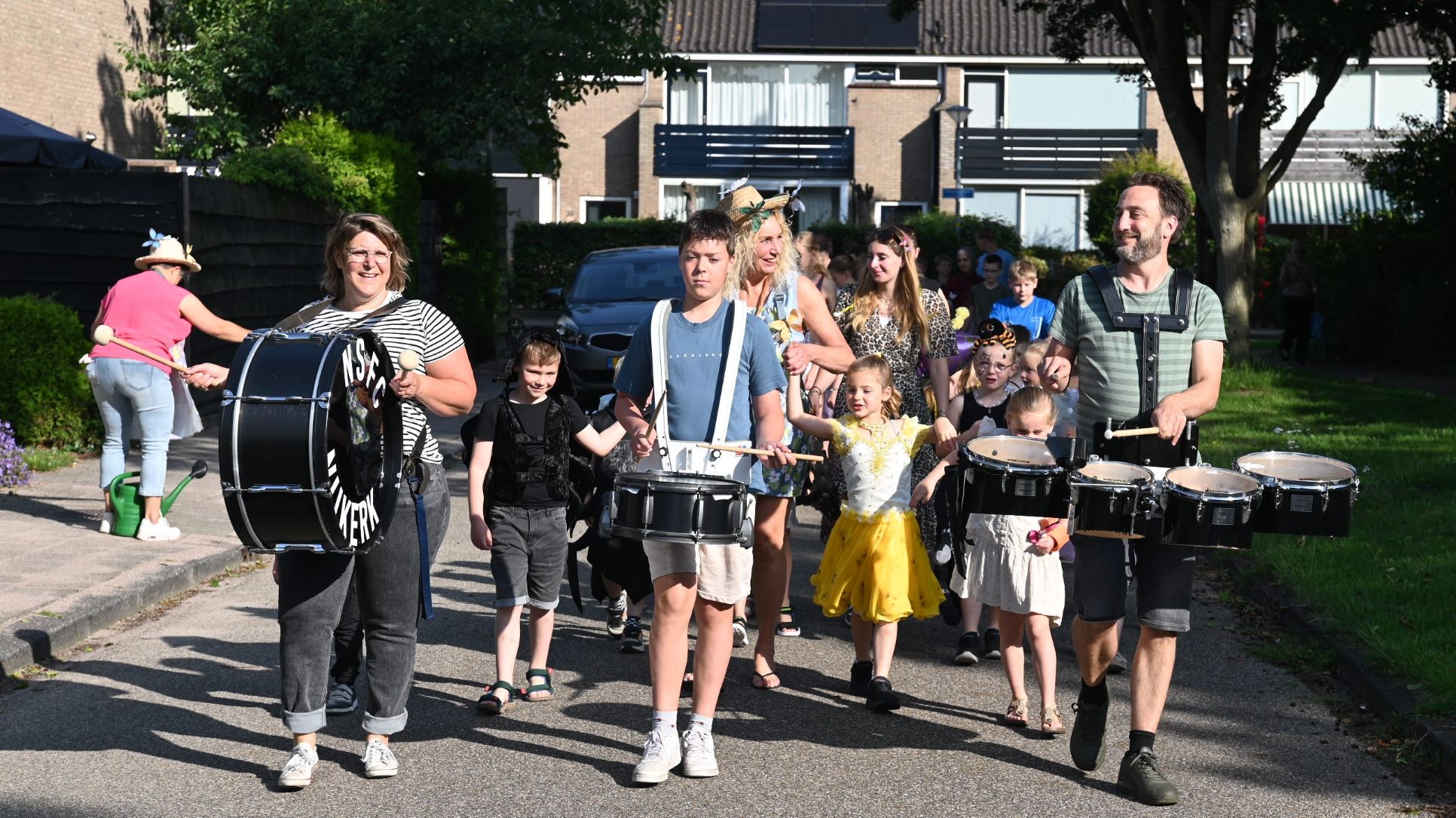 Vrijdag 13 juni begon voor kindcentrum Prins Willem-Alexander muzikaal. Op de noodlocatie Bizetlaan werd een peuter/kleuterfeest georganiseerd. Het werd een kriebelbeestjesfeest, veel leerlingen waren verkleed als insecten. Onder aanvoering van enkele muzikanten van het Nijkerks Stedelijk Fanfare Corps liepen de kinderen een rondje om het schoolgebouw. Foto Kees van den Heuvel