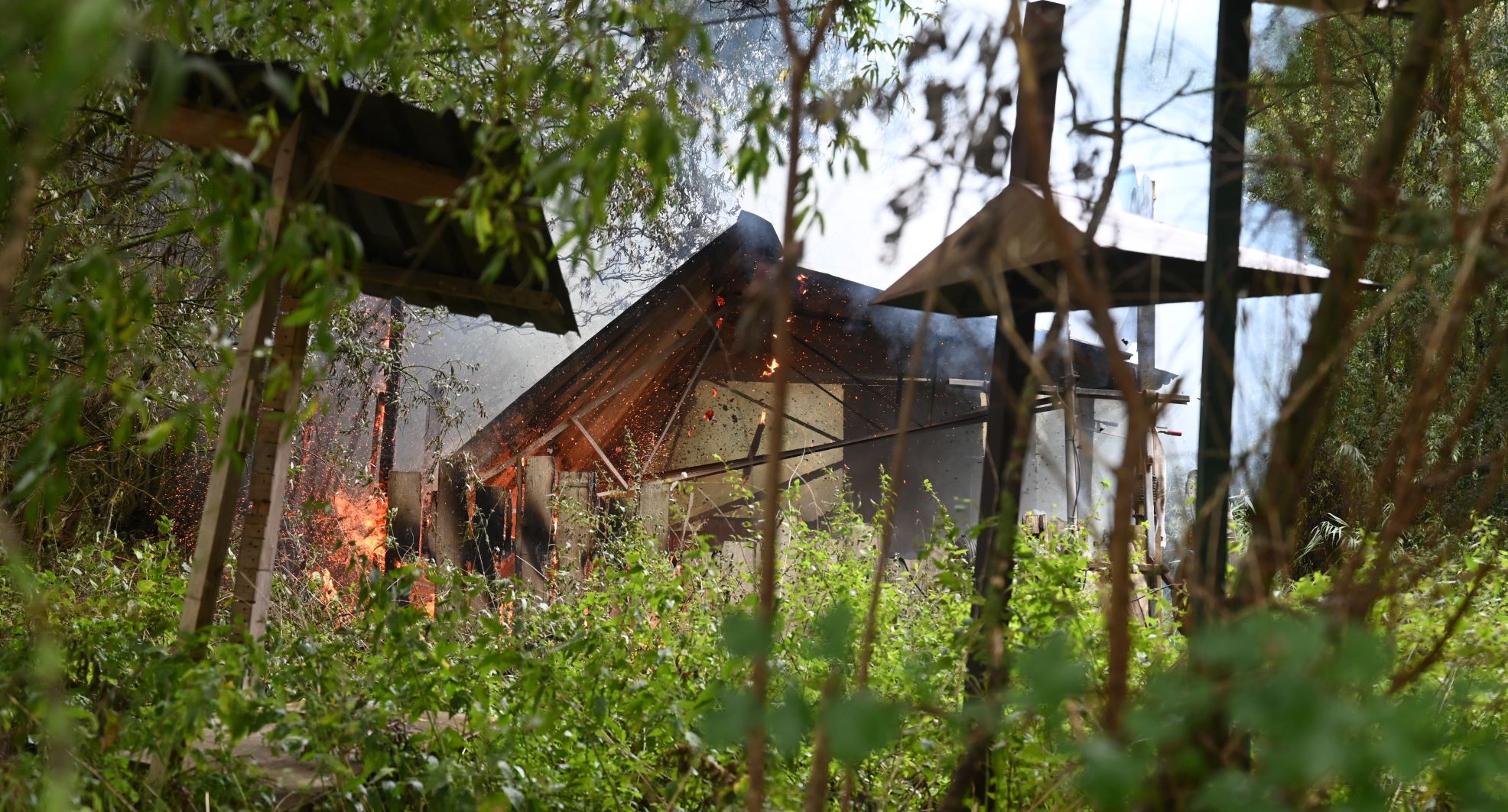 De hulpdiensten waren zondagmorgen 5 oktober nodig voor een brand op de Domstraat. Een kapschuur is daarbij helemaal afgebrand. Precies op het moment dat de brandweer van Nijkerk arriveerde bezweek het gebouw en zakte het dak in elkaar. De oorzaak van de brand is nog niet bekend. Foto Kees van den Heuvel