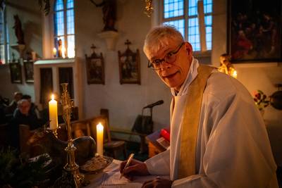 LITH - Pastoor René Aarden leidde deze kerstavond vijf missen achter elkaar en sjeesde dus door de regen van dorp naar dorp. Om 17.00 uur leidde hij - op zijn warme, eigen wijze - de tweede dienst, in het kerkje in Teeffelen. Daarvóór, om 15.00 uur was de kinderkerstviering in Lith. Daarna volgen er nog drie. Net voor de laatste mis dreigde zijn strakke planning in de soep te lopen...