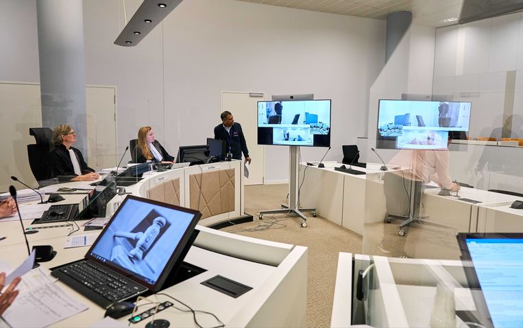 Een zitting in de ‘anderhalvemeterrechtbank’ van Den Haag tijdens de coronacrisis. Tussen de rechters zijn plexiglas schermen geplaatst. De verdachten worden via een videoverbinding gehoord.