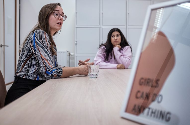Nathalie Dijkman (links) en Nesrine Khalloufi (rechts) in een van de spreekkamers van de Vrouwenrechtswinkel in Amsterdam.