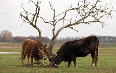 KEENT - Als je jeuk hebt, moet je krabben. Dat geldt ook voor dieren die hun wintervacht in de lente weer omruilen voor het zomerdek. Deze tauros in Keent lijkt een plek te zoeken om kriebelende haren kwijt te raken.