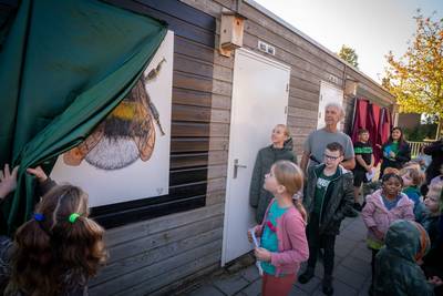 HETEREN - Hoe zet je de Kinderboekenweek als school extra in het zonlicht. Door het thema, Dieren en natuur Gi-ga-groen, op zes gigantische panelen uit te werken voor op het schoolplein, dachten ze bij basisschool Tuin 17 in Heteren. Werk van conciërge Roberto ten Hoedt.