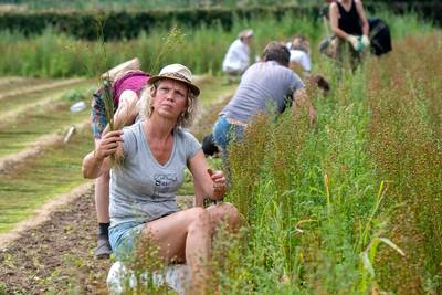 HEMMEN/ARNHEM - Voor het eerst sinds vele jaren is in de eerste week van augustus door modeliefhebbers vlas met de hand geplukt in Hemmen. Zij willen het uitgestorven ambachtelijk handwerk nieuw leven inblazen. Onder hen oud-studenten van de mode-opleiding ArtEZ in Arnhem.