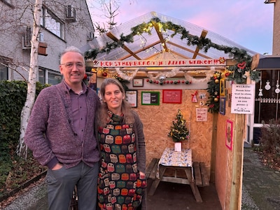 Wie langs het huis van Rogier Hörchner en Yvette Groenendael in Princenhage loopt, kan het bijna niet missen. In de voortuin staat een klein kerstherbergje met lichtjes, een tafel, gezellige versieringen, een kan thee, een glazen kan ranja en een bord: Kerstherberg(t)je: allen welkom!