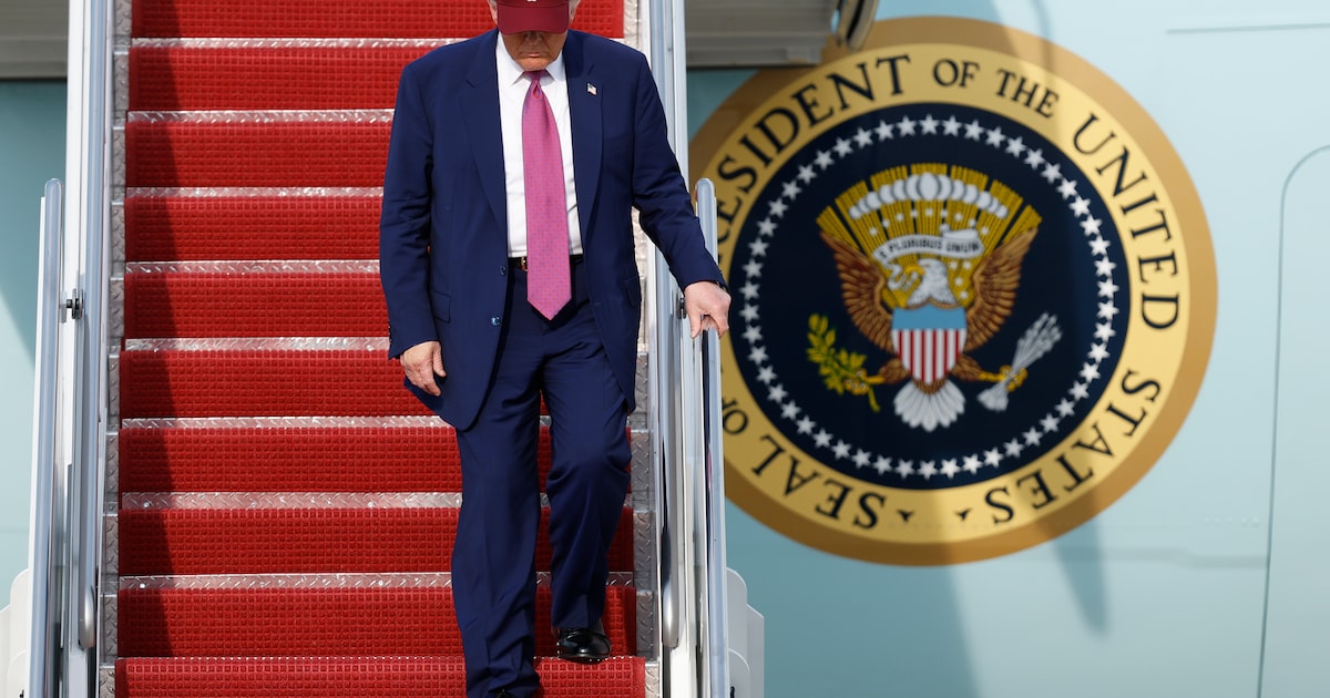 Amerikaans president Donald Trump verlaat de Air Force One, dinsdag bij een bezoek aan een legerbasis in Maryland.