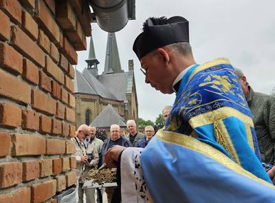 HOOGE MIERDE – Met een stevige veeg legt pastoor David van Dijk de eerste steen van de nieuwe kapel op de begraafplaats Hooge Mierde vast. Nu de steen stevig ingemetseld is kan de nieuwe kapel verder afgebouwd worden en vanaf 22 september kunnen er de kaarsjes branden.