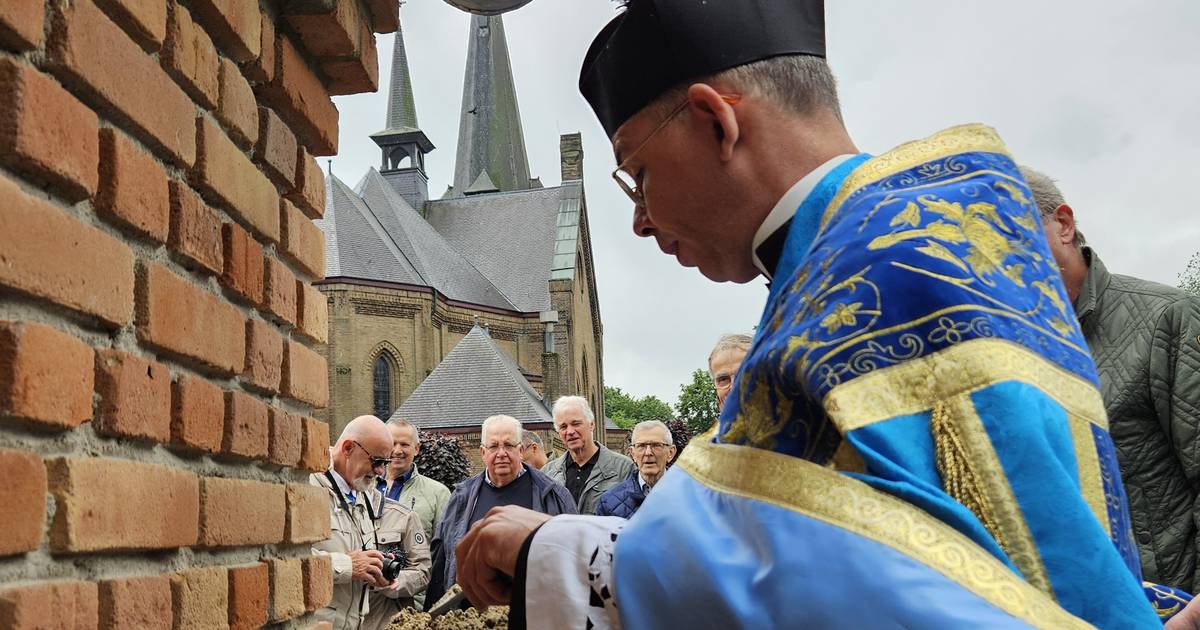 HOOGE MIERDE – Met een stevige veeg legt pastoor David van Dijk de eerste steen van de nieuwe kapel op de begraafplaats Hooge Mierde vast. Nu de steen stevig ingemetseld is kan de nieuwe kapel verder afgebouwd worden en vanaf 22 september kunnen er de kaarsjes branden.