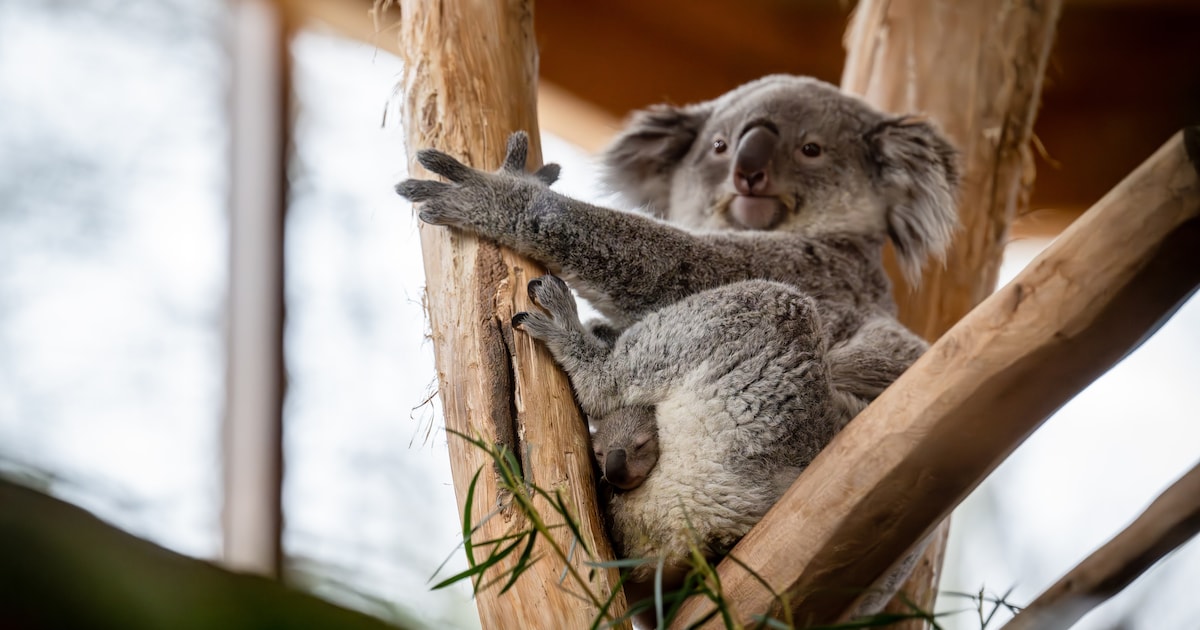 In Ouwehands Dierenpark in Rhenen is het eerste koala jong van Nederland volledig zichtbaar. Het jong, dat in het voorjaar is geboren, heeft maandenlang in de buidel van de moeder gezeten.