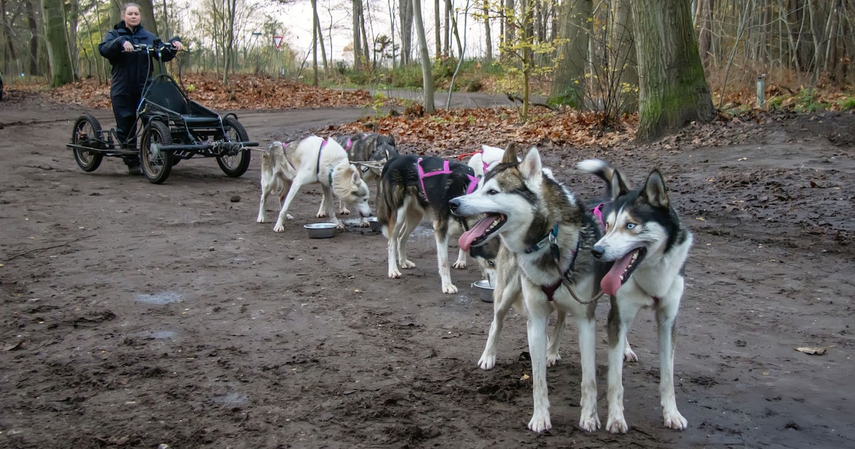 Letterlijk stuiterend komen zes husky’s uit een bus. Ze hebben zin om de kar van Lonneke Bom te gaan trekken. Heel veel zin. En dat uiten ze door enorm hard en enthousiast te blaffen. Het geluid schalt in alle vroegte door het bos bij Schijf.