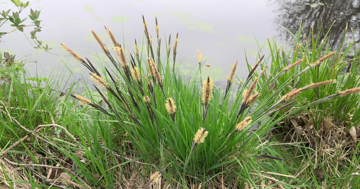 Op verschillende plekken aan het water zie ik grote, fraaie graspollen in bloeien. Ik ben niet zo thuis in de grassen, maar als ik in de stengels knijp, voel ik duidelijk dat die driekantig zijn. Dat betekent dat het zeggen zijn.