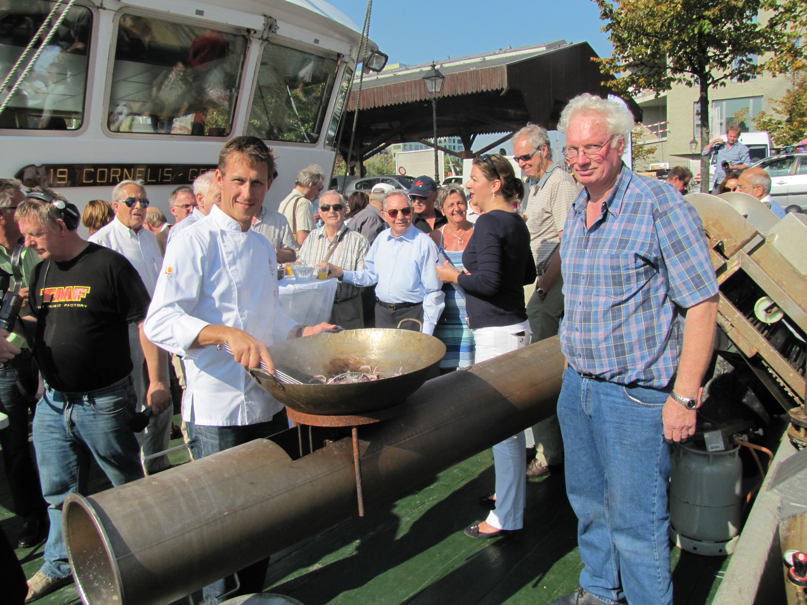 Chef Jo Bussels van het Antwerpse restaurant Radis Noir kookte ze volgens zijn recept aan boord van het schip. Toegestroomde 'proevers' lieten ze zich goed smaken. Jo verklapte nadien zijn mosselgeheimen. Voor 2 kilo mosselen neem je 100 g. gerookte spekblokjes en evenveel hoeveboter. Verder twee versnipperde rode uien en 20 g. fijngesneden selderblaadjes. Mespuntje cayennepeper en mespuntje currypoeder. Een teentje geplette look, 250 g. gekonfijte tomaten, 100 ml witte wijn en 20 g. fijngesneden basilicum. Spekblokjes en rode ui stoven, mosselen en al de rest (uitgenomen de basilicum) bijvoegen. Gedurende enkele minuten laten koken. Opschudden. Net voor het opdienen afwerken met basilicum.Okt ober-november bestGerd , de zoon van Leen de Keijser, legde uit hoe de mosselkweek en het verwateren van de schelpdieren in Zeeland in zijn werk gaan. Christine Fijnaut, communicatiemanager van het mosselkantoor in Yerseke, bepleitte het genieten van mosselen (rauw, gekookt, gestoofd, gebakken) niet alleen in de zomermaanden, maar vooral in oktober, november en zelfs december. 'Dan zijn ze eigenlijk op zijn best', zei ze.Kijk ook eens onder www.pvis.nl en ontdek dat er in Nederland jaarlijks bijna 60 miljoen kilo mosselen worden geveild en dat een tachtigtal kotters, zoals de Bru 19 ze aanvoeren. Per koelwagen gaan ze naar verdelers, winkels en restaurants, waarvan een groot deel in Antwerpen. (sdl)
