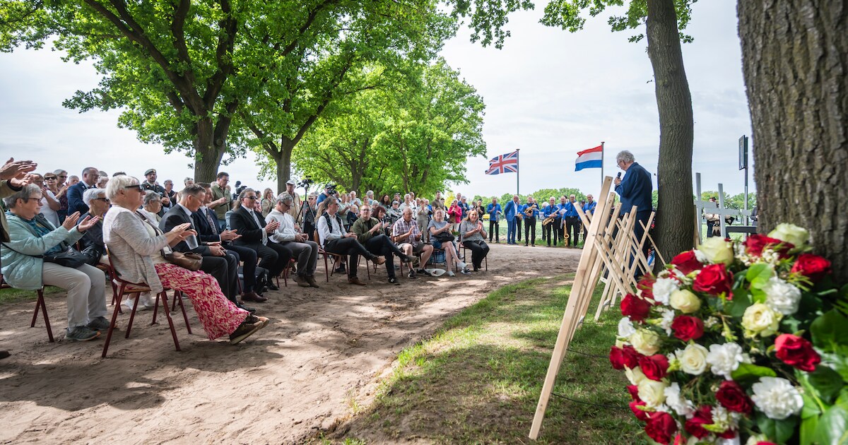 Engelsman Neil is met zijn zoon Samuel bij de herdenking van de verongelukte Lancaster-bommenwerper. De zeven bemanningsleden kwamen bij Stevensbeek om het leven, onder wie de 23-jarige Walter Watts, de oom van Neil.