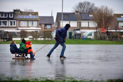 DE HEEN – Buurman van de ijsbaan Jeroen Saarloos gaat deze donderdagochtend wat vastgevroren blokken te lijf met een spade en een bezem: de vorige avond reed een pick-up de ijsbaan op. ,,Het is nog veilig hoor, maar ik zet dit deel wel af zodat de kinderen niet vallen.”