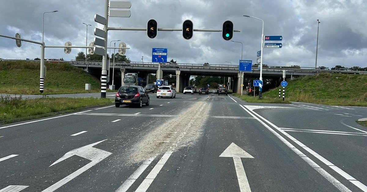 Een kapotte cementwagen heeft dinsdagochtend een spoor achtergelaten op de N294 bij Urmond. Op beide richtingen van de weg ligt cement. Een aannemer gaat het cement opruimen, wat voor verkeershinder zorgt.