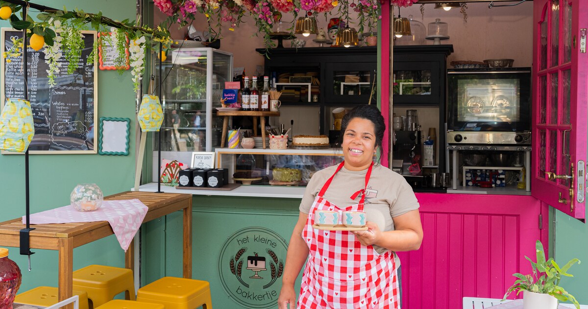 Laura Hagmeijer voor Het Kleine Bakkertje in Maarn, de kleinste bakkerij van Nederland met slechts 5,3 vierkante meter. Foto: AD/Mel Boas.