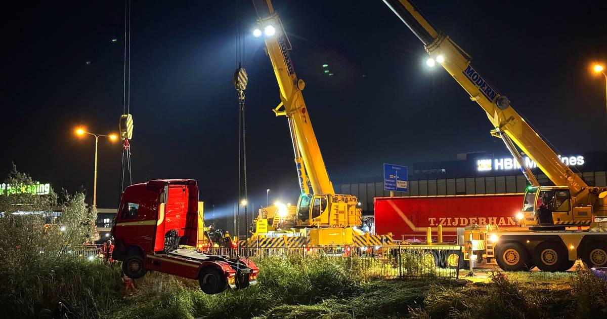 Vrachtwagen raakt te water, chauffeur gewond; truck met twee grote hijskranen uit sloot getakeld