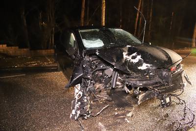 APPELTERN - Op de Dijkgraaf de Leeuwweg in Appeltern is donderdagavond laat een ongeluk gebeurd. Een auto klapte tegen twee bomen en kwam dwars op de weg tot stilstand.