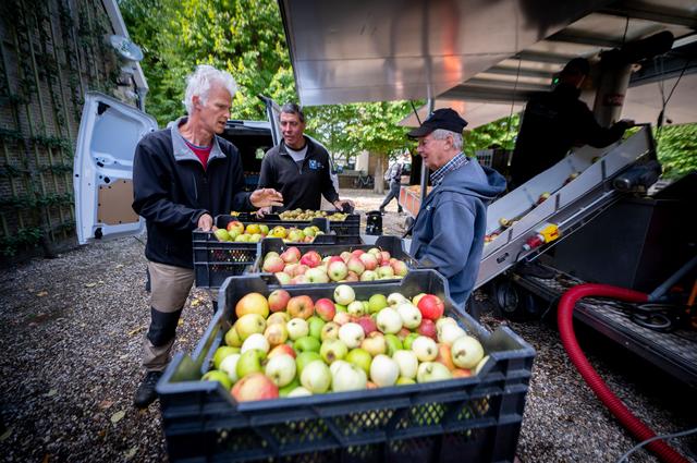 Jan Kuppens (midden) zorgt er elk jaar voor dat de fruitpers naar het Poptaslot komt. Foto: Jacob van Essen
