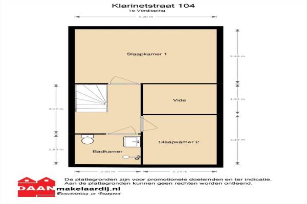 Het adres van deze woning uit 1991 is Klarinetstraat 104 te Almere. Het pand heeft een oppervlakte van 67m² en een perceeloppervlakte van 121m² en heeft 3 kamers kamers waarvan 2 slaapkamers. De geschatte waarde van deze woning is € 169.500.