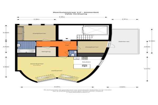 Het adres van deze woning uit 2000 is Meerhuizenstraat 11T te Amsterdam. Het pand heeft een oppervlakte van 87m² en heeft 3 kamers kamers waarvan 2 slaapkamers. De geschatte waarde van deze woning is € 500.000.